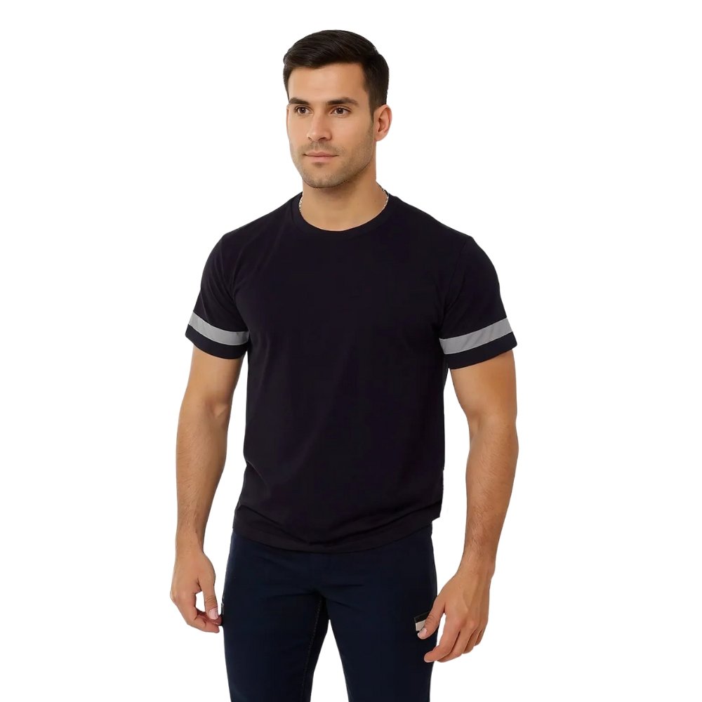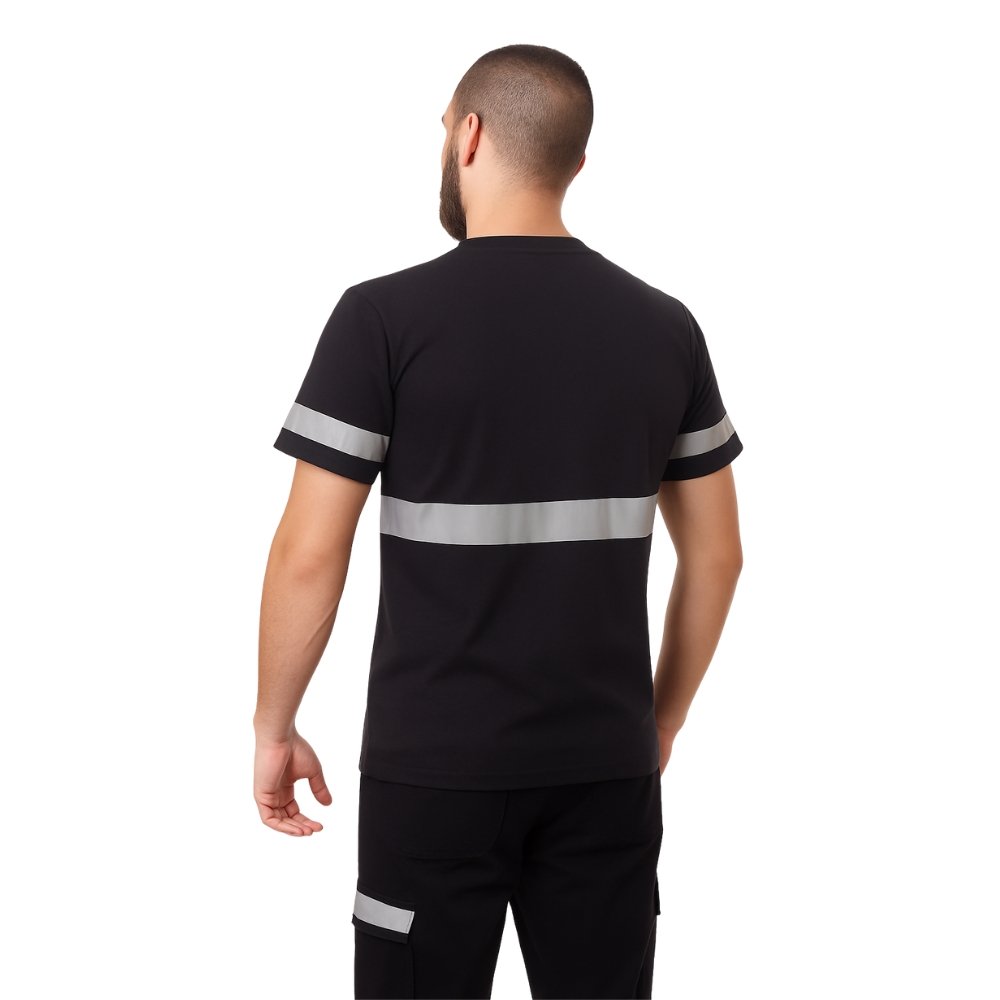 חולצת טריקו בעיצוב בטיחותי עם פסים זוהרים, המתאימה לעובדים בסביבות עבודה הדורשות נראות גבוהה.